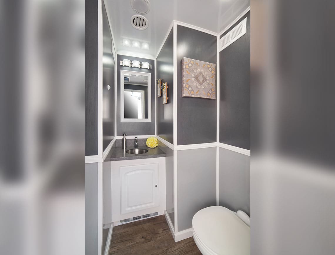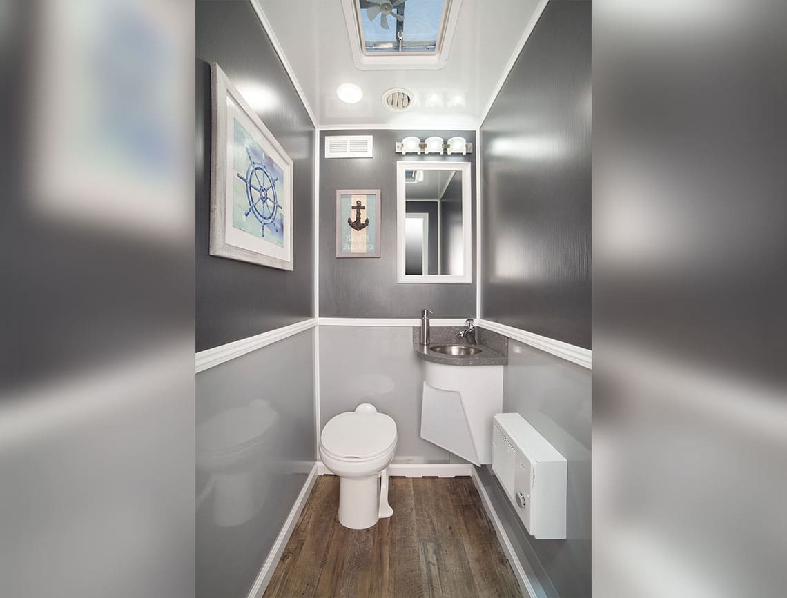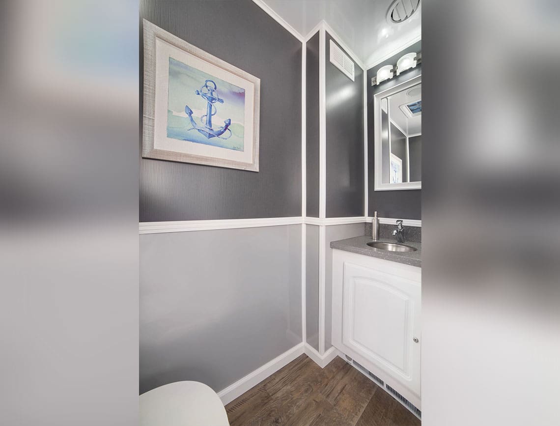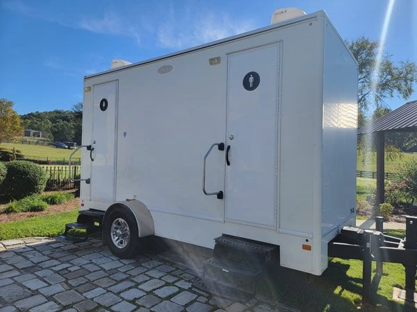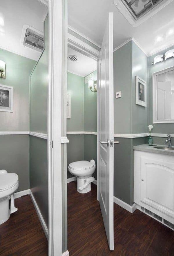 Our four-stall restroom trailer is perfect for larger weddings, corporate events, and remodels. We offer two different floor plans. One is a multi-stall unit featuring two exterior entries (male and female), with two toilet stalls and a sink/vanity on the female side and a toilet stall, a urinal, and a sink/vanity on the male side.  The other floor plan features four private stalls with exterior entrances.  All four stalls feature a toilet and sink/vanity.